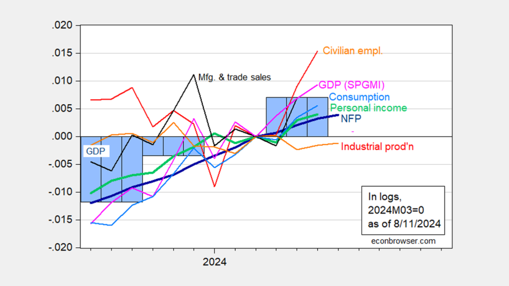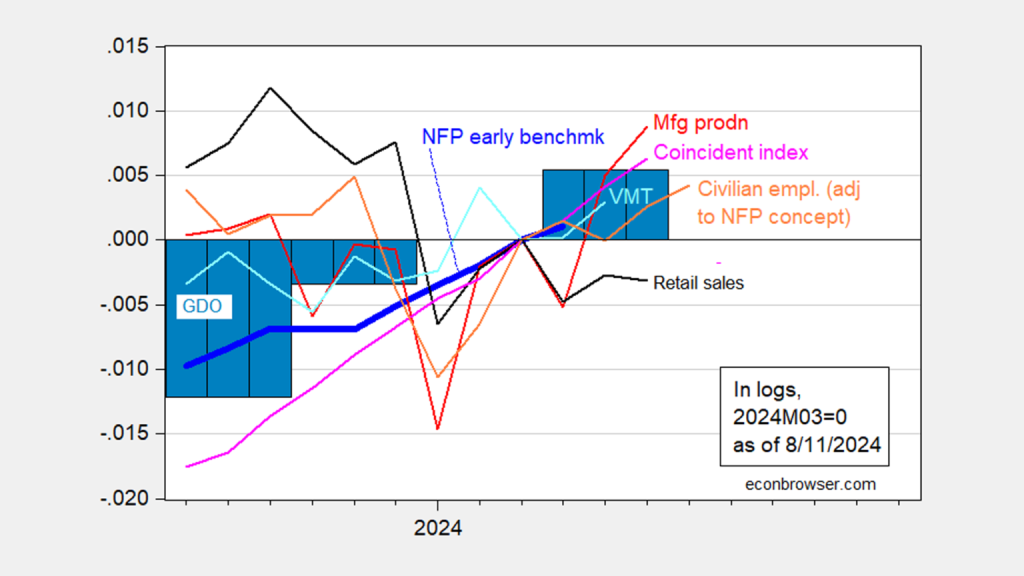 Author’s calculations and BLS via FRED, Federal Reserve, BEA 2024Q2 advance release, Philadelphia Fed. While all of these series will undoubtedly be revised to varied degrees, GDP is the one that is most vulnerable, which is why NBER’s BCDC gives it the least weight.